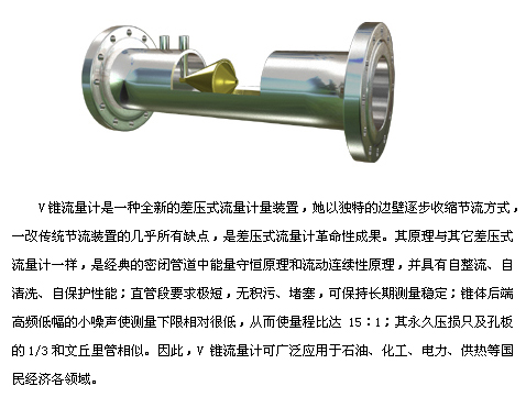 V錐流量計是一種全新的差壓式流量計量裝置,并以******的邊壁逐步收縮節(jié)流方式,一改傳統(tǒng)節(jié)流的幾乎所以缺點,是差壓式流量計革命性成果,因此V錐流量計可廣泛用于石油,化工,電力,熱供等國民經(jīng)濟各領(lǐng)域